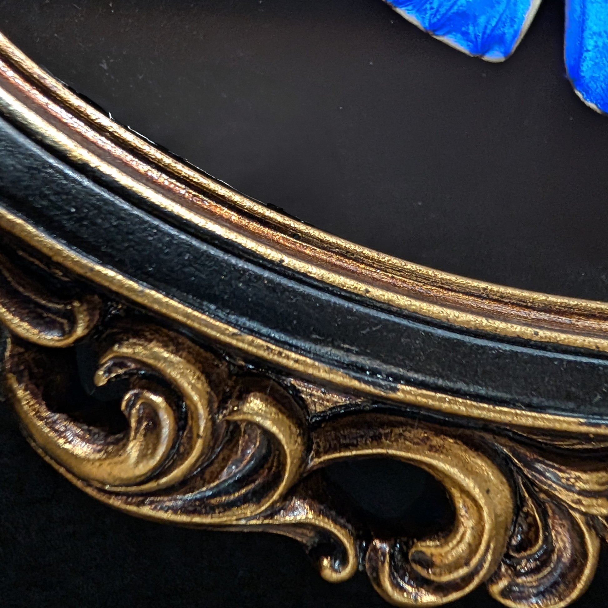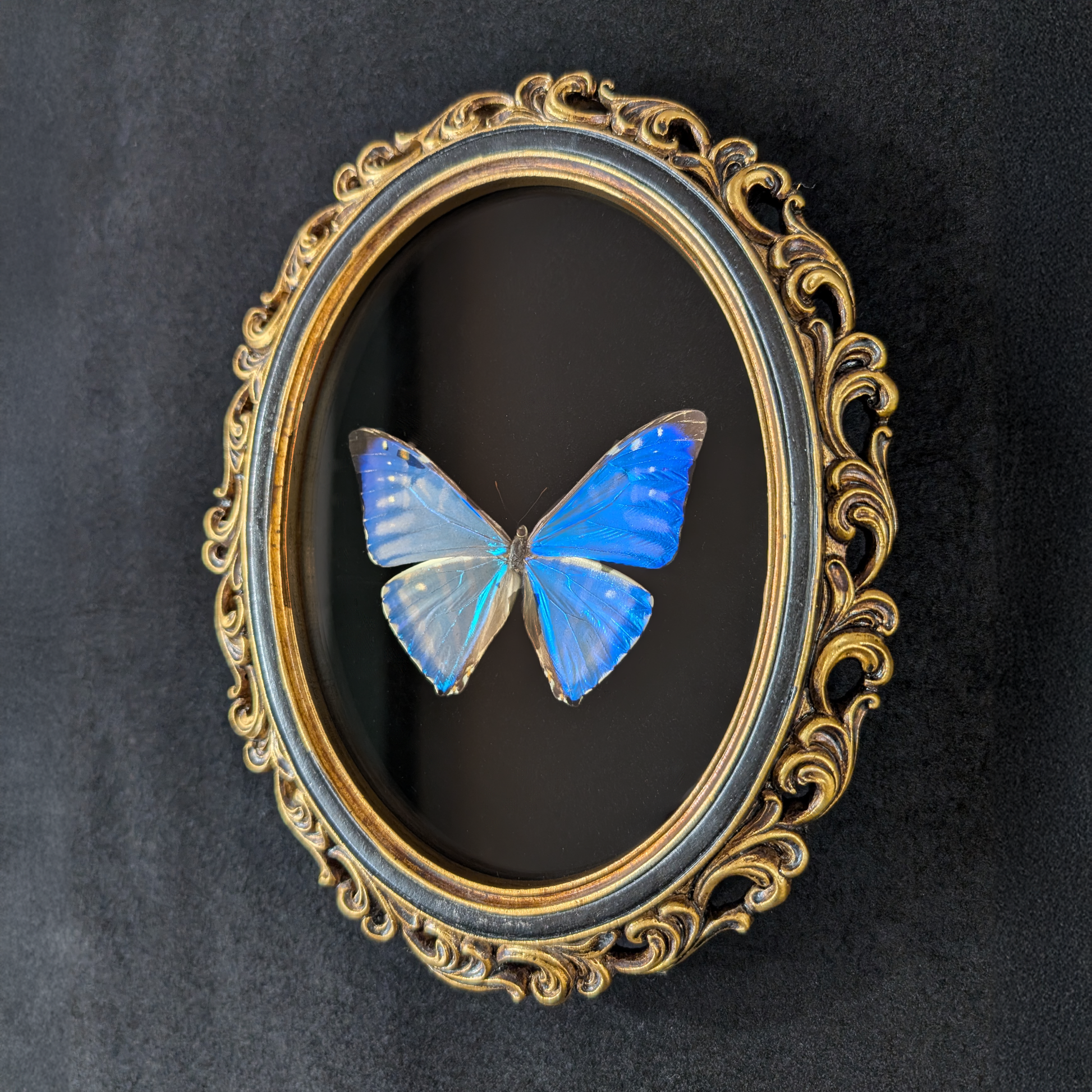 This gorgeous iridescent blue Morpho zephyritis butterfly has been carefully set in a unique antique-style gold-and-black oval frame. The wings practically glow against the black velvet! Framed here at Esoterica.