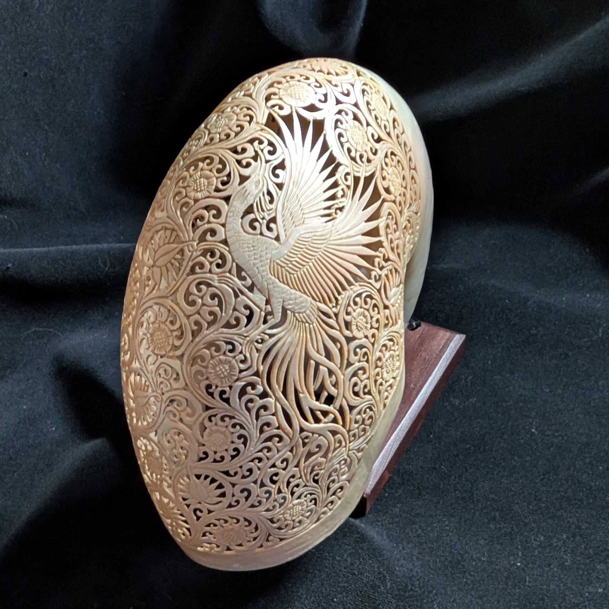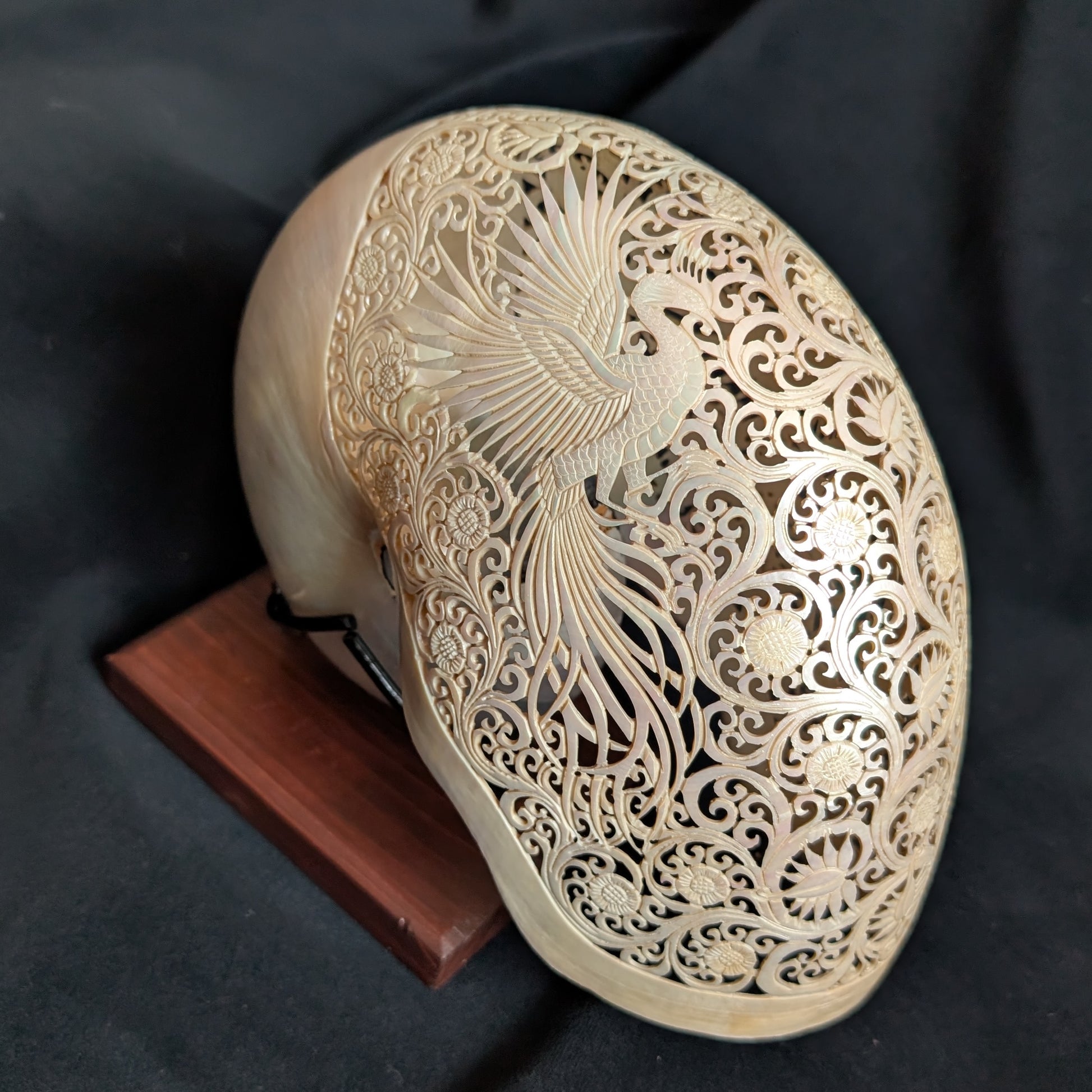 This is a real nautilus shell, intricately hand-carved with a delicate phoenix motif. Stand included.