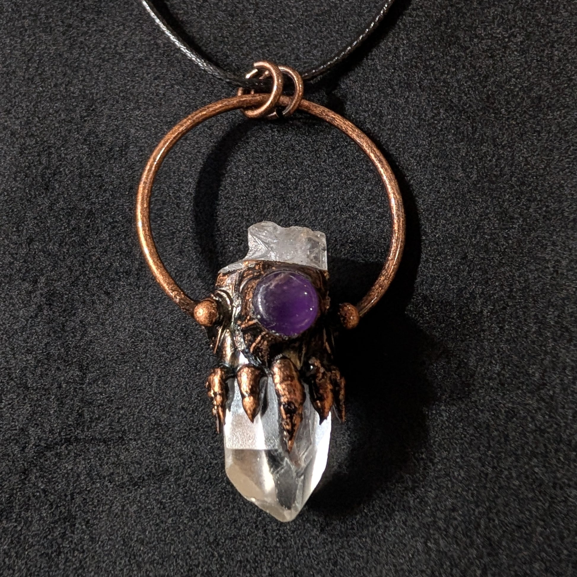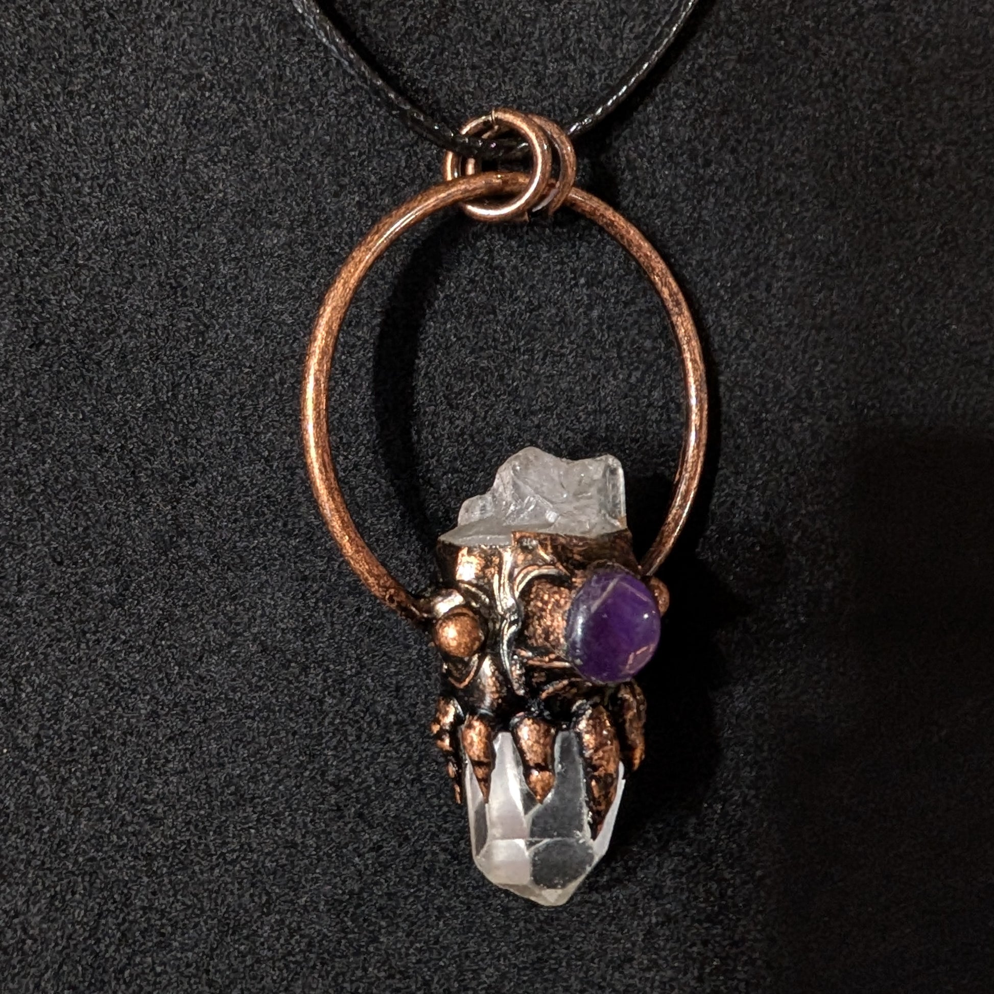 Channel your energy with this lovely clear quartz crystal, hand-set in copper with a glowing amethyst!