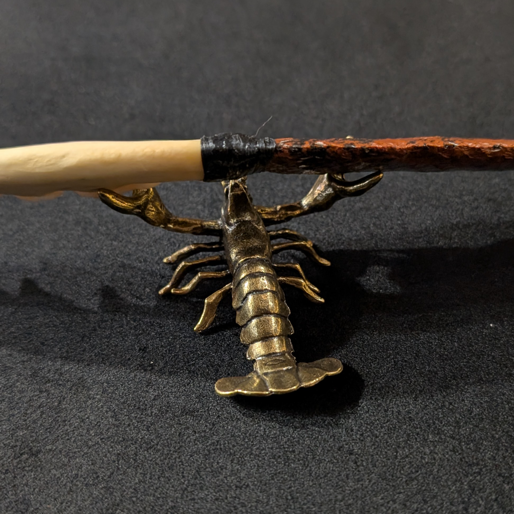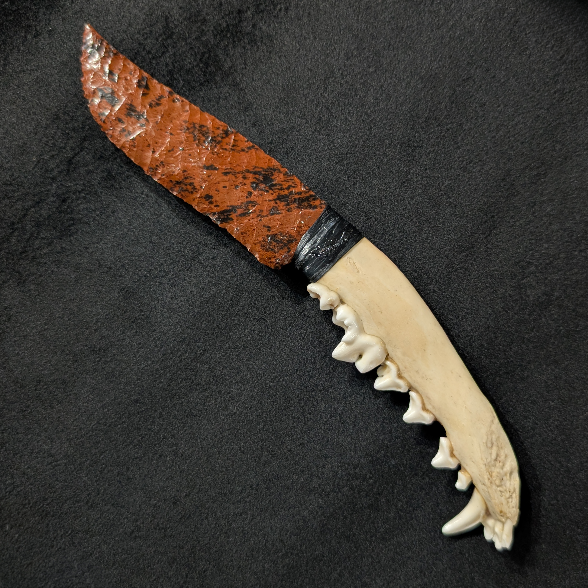 This unique hand-crafted knife is perfect for all your ritual sacrifice dramatic oddity displays. Made in Austin, TX from foraged coyote jaw with a sharp mahogany obsidian blade. Excellent for striking fear in the heart of your enemies, though potentially painful to use as an actual cutting implement.