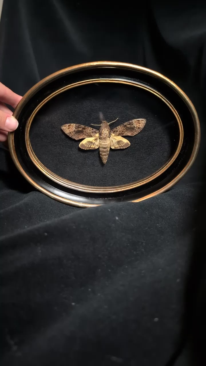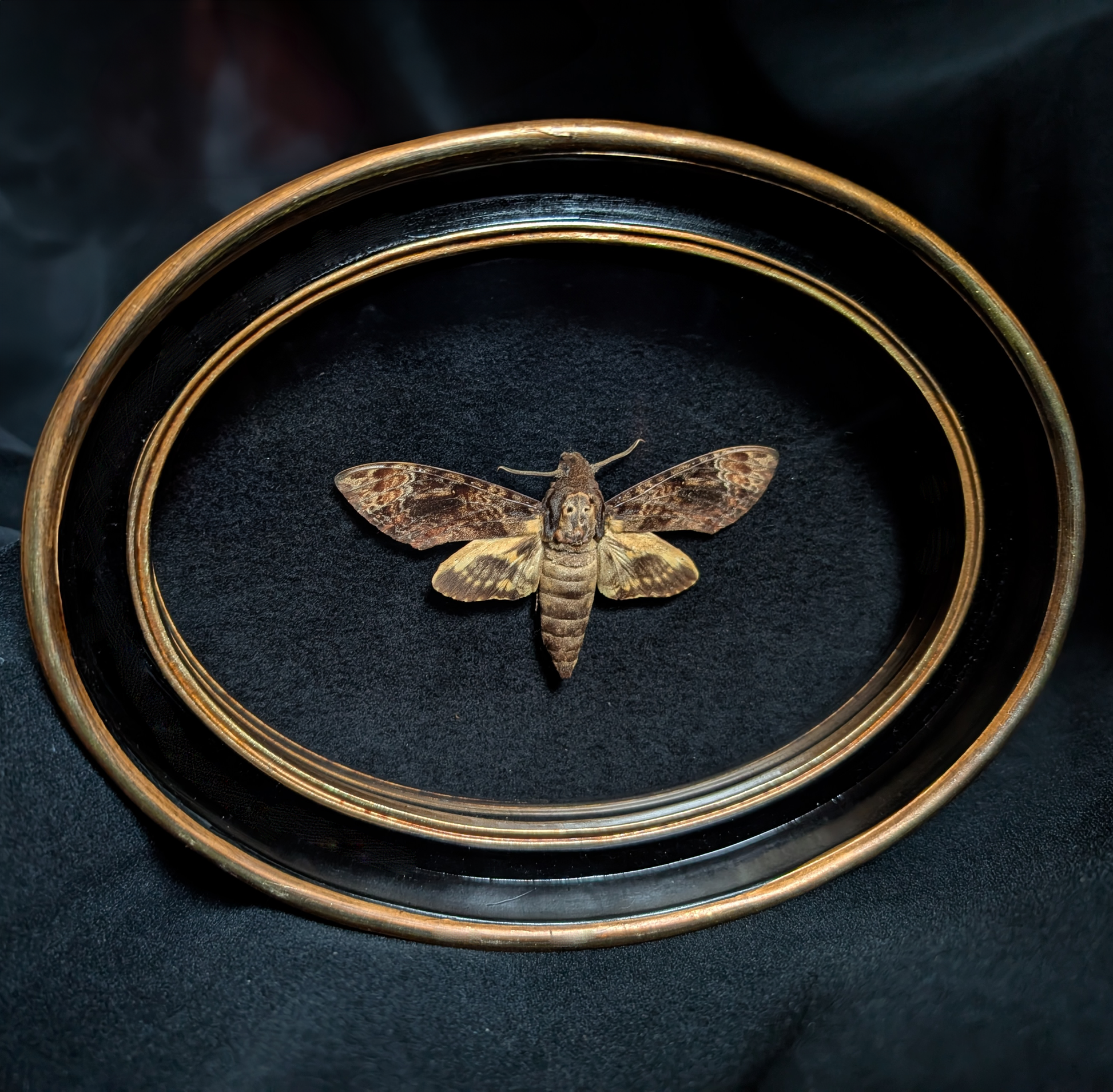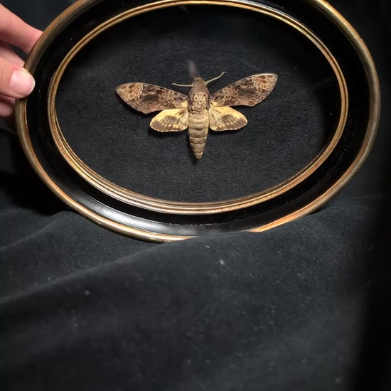 This stunning real Death's head hawkmoth is set in a custom oval frame, hand-painted in black with gold accents, over a soft velvet background, and protected with glass. Understated and elegant for any decor style.