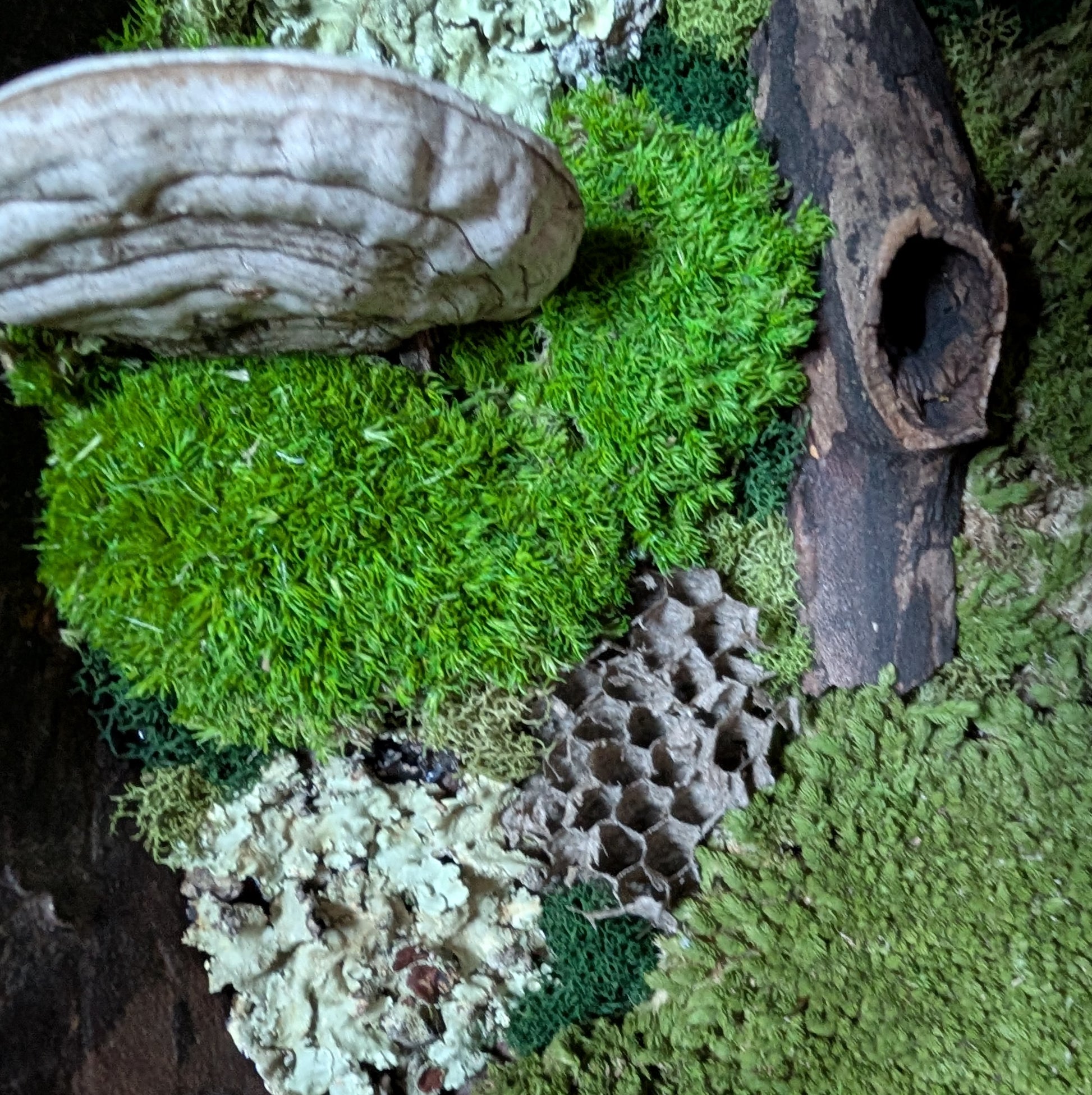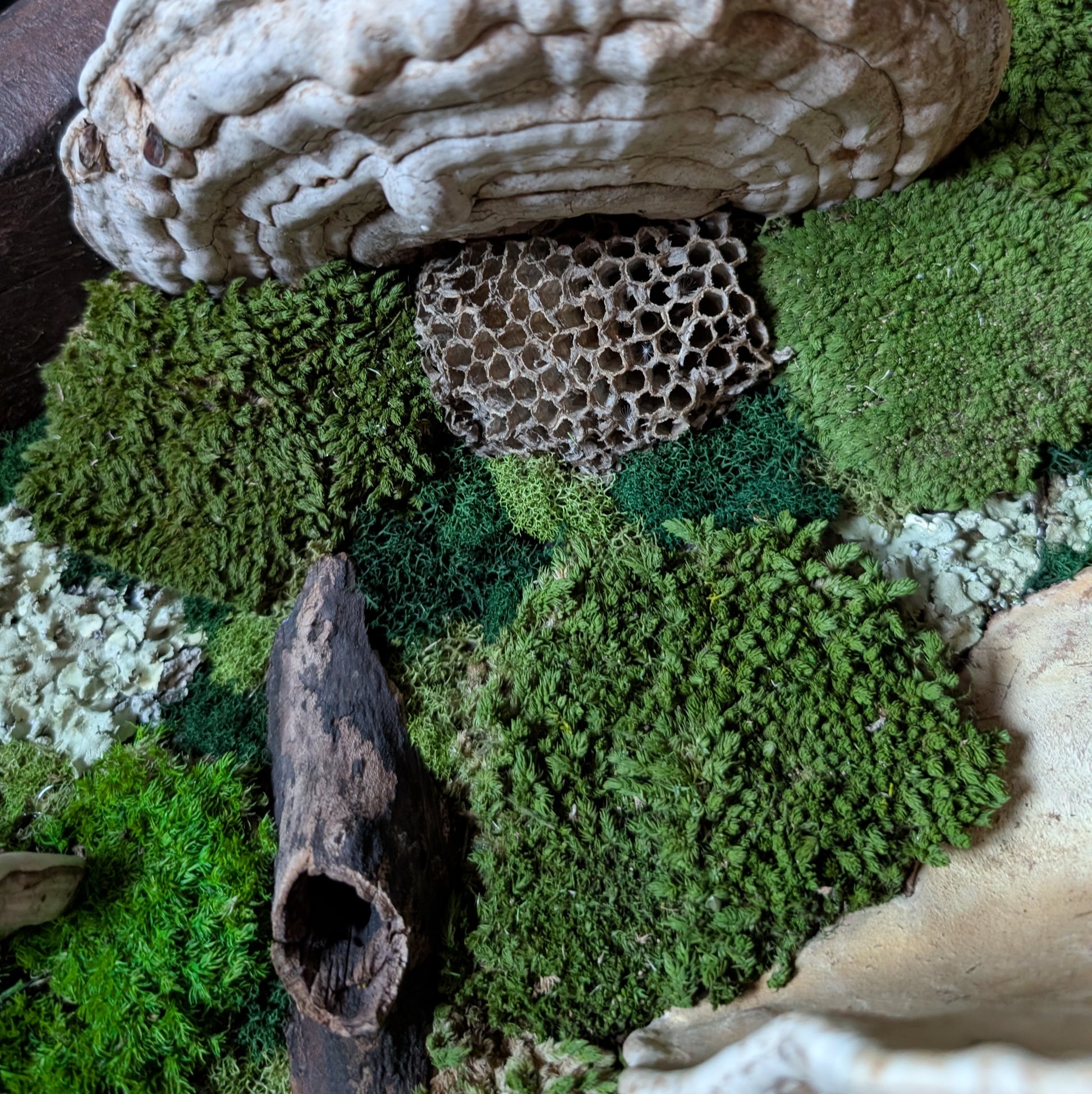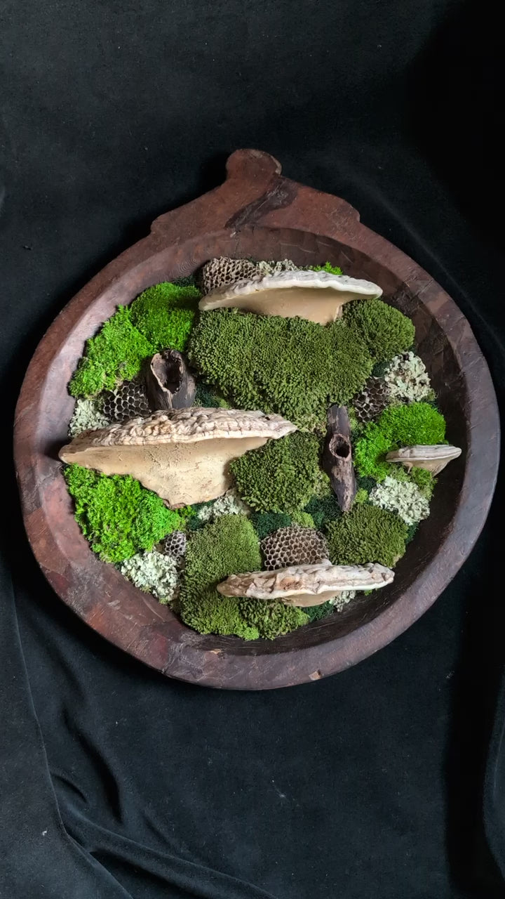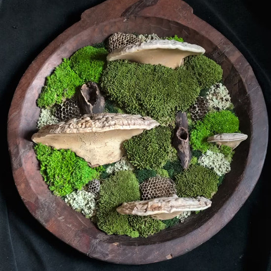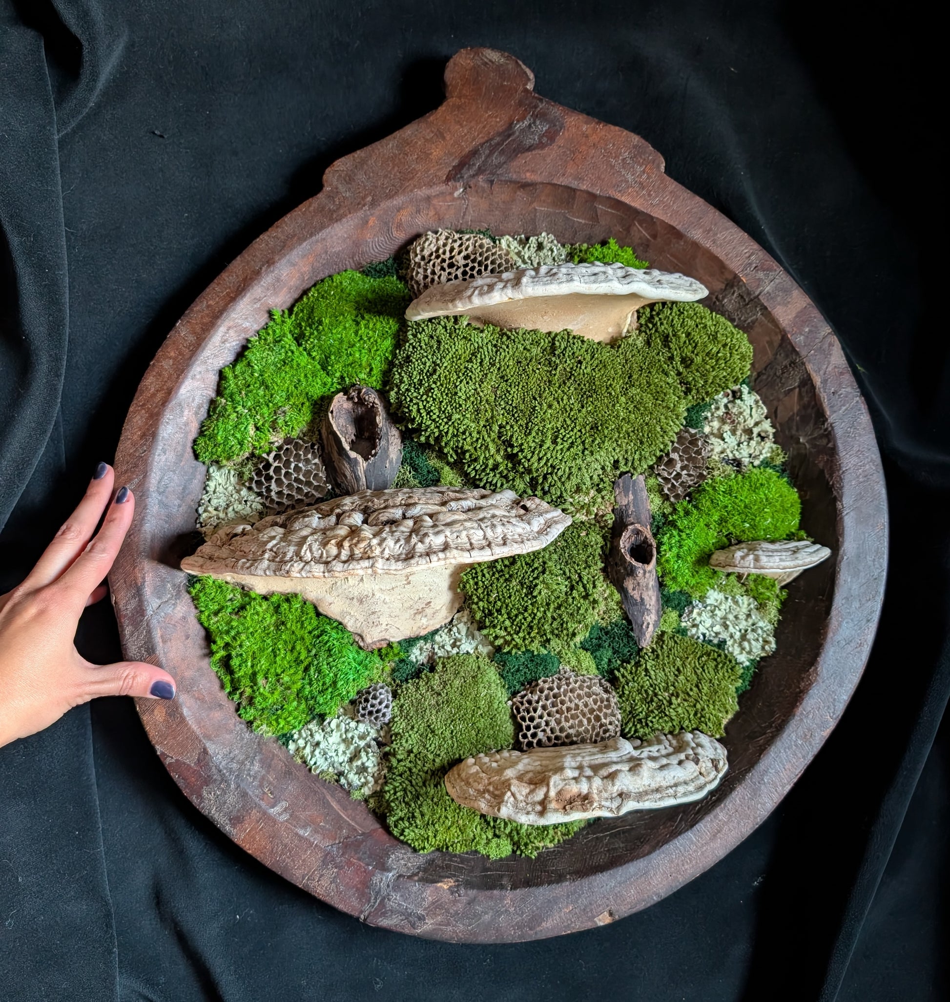 This beautiful forest art piece, measuring an impressive 20" tall, features locally foraged mushrooms, honeycomb, and moss on a large antique wooden tray. Made by a local artist, Detritus & Decay art.