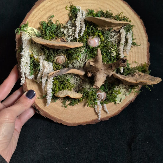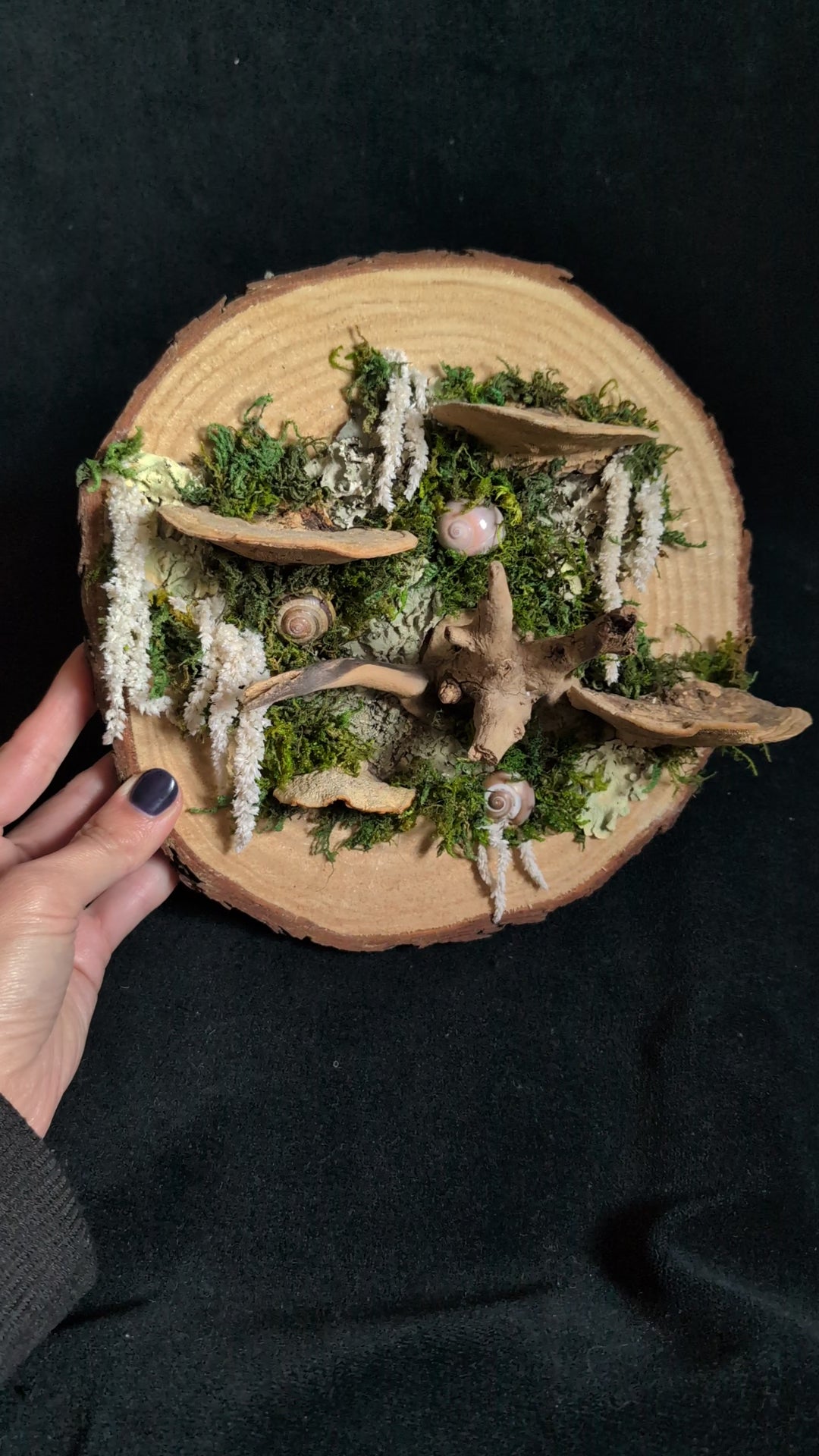 This little wood cookie plaque is hand-made with locally foraged mushrooms, moss, dried flower vines, and iridescent snail shells by a local artist, Detritus & Decay Art.