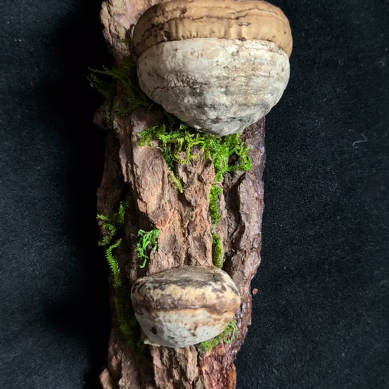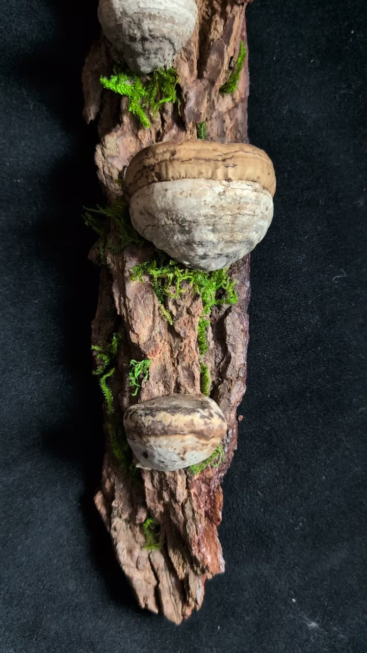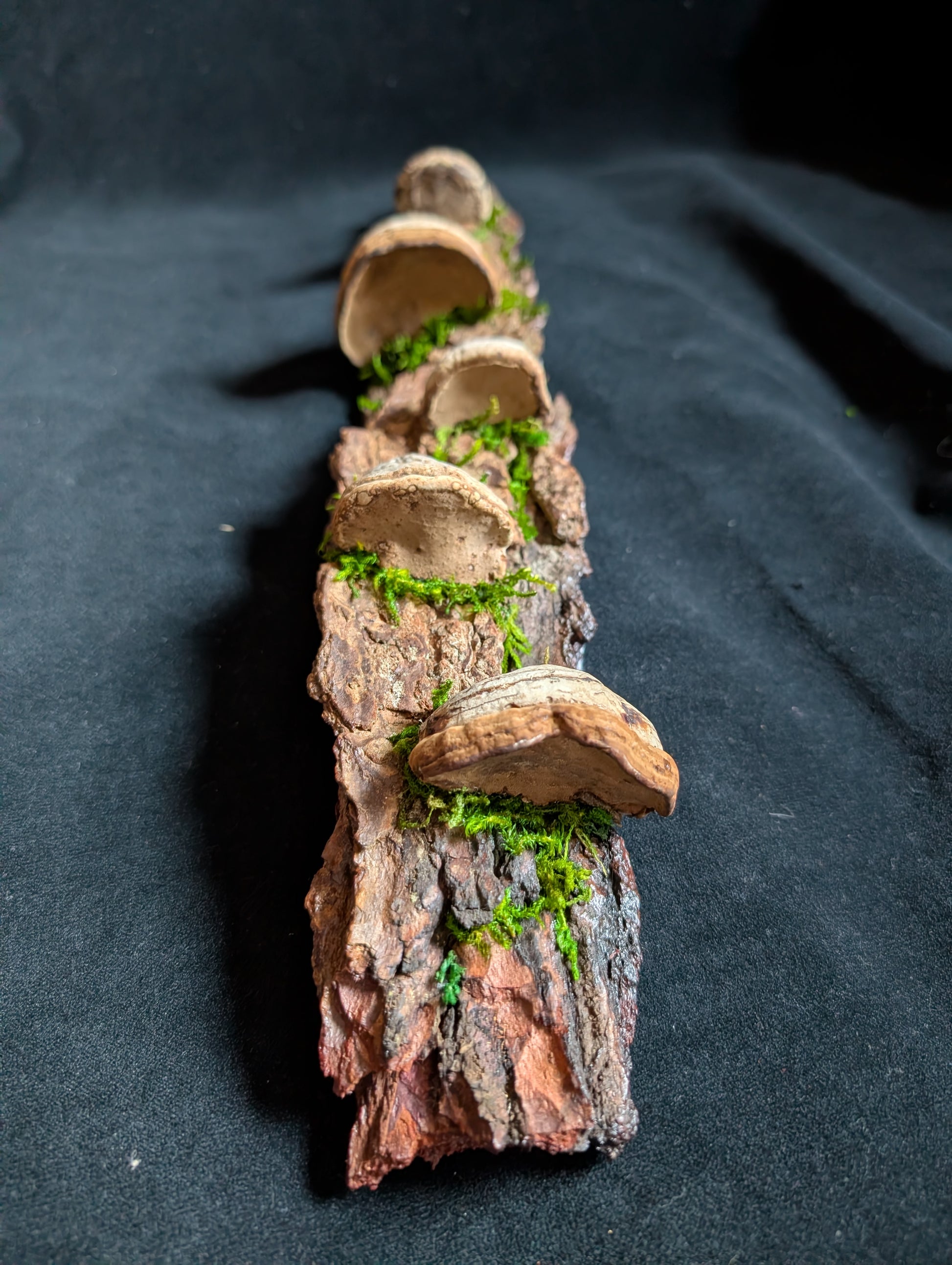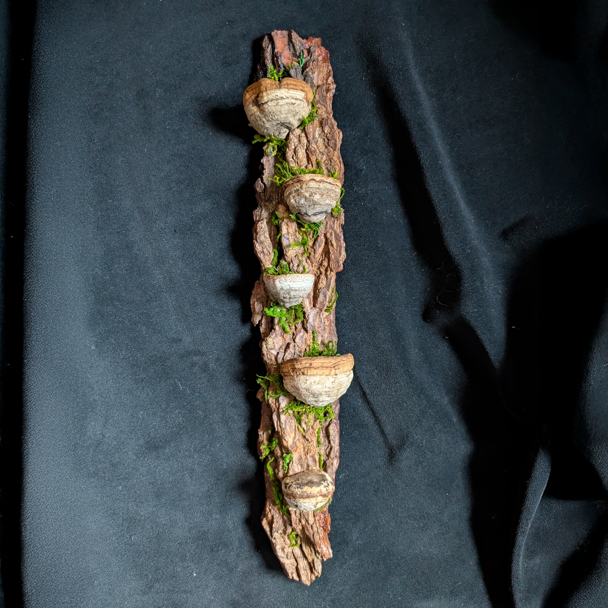 This beautiful shelf features locally foraged mushrooms and moss on hemlock bark. Reversible - can be hung with fungi facing up or down. Hang it on a wall as-is, or add our brass insect figurines to the shelves for a bit of sparkle! Made by a local artist, Detritus & Decay art.