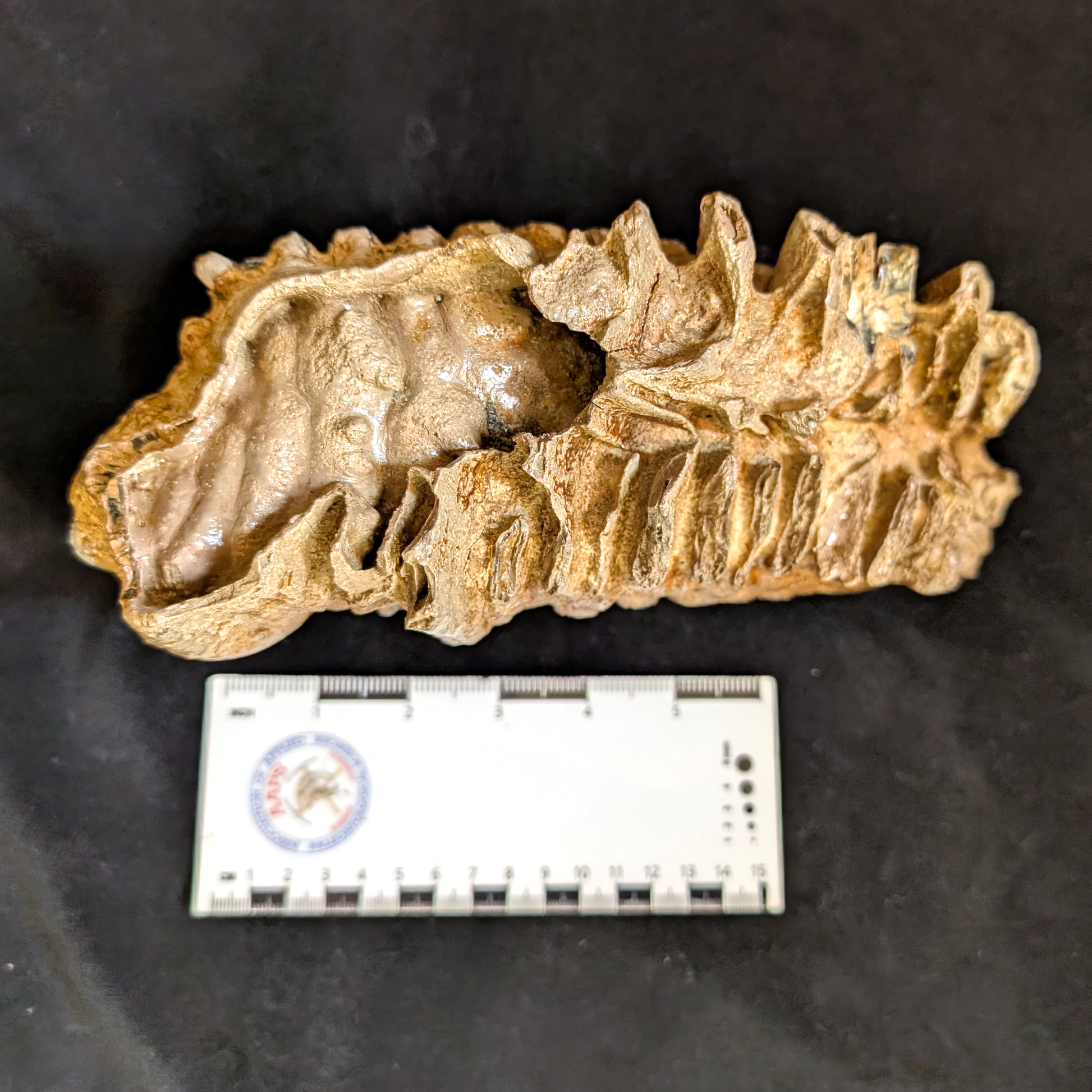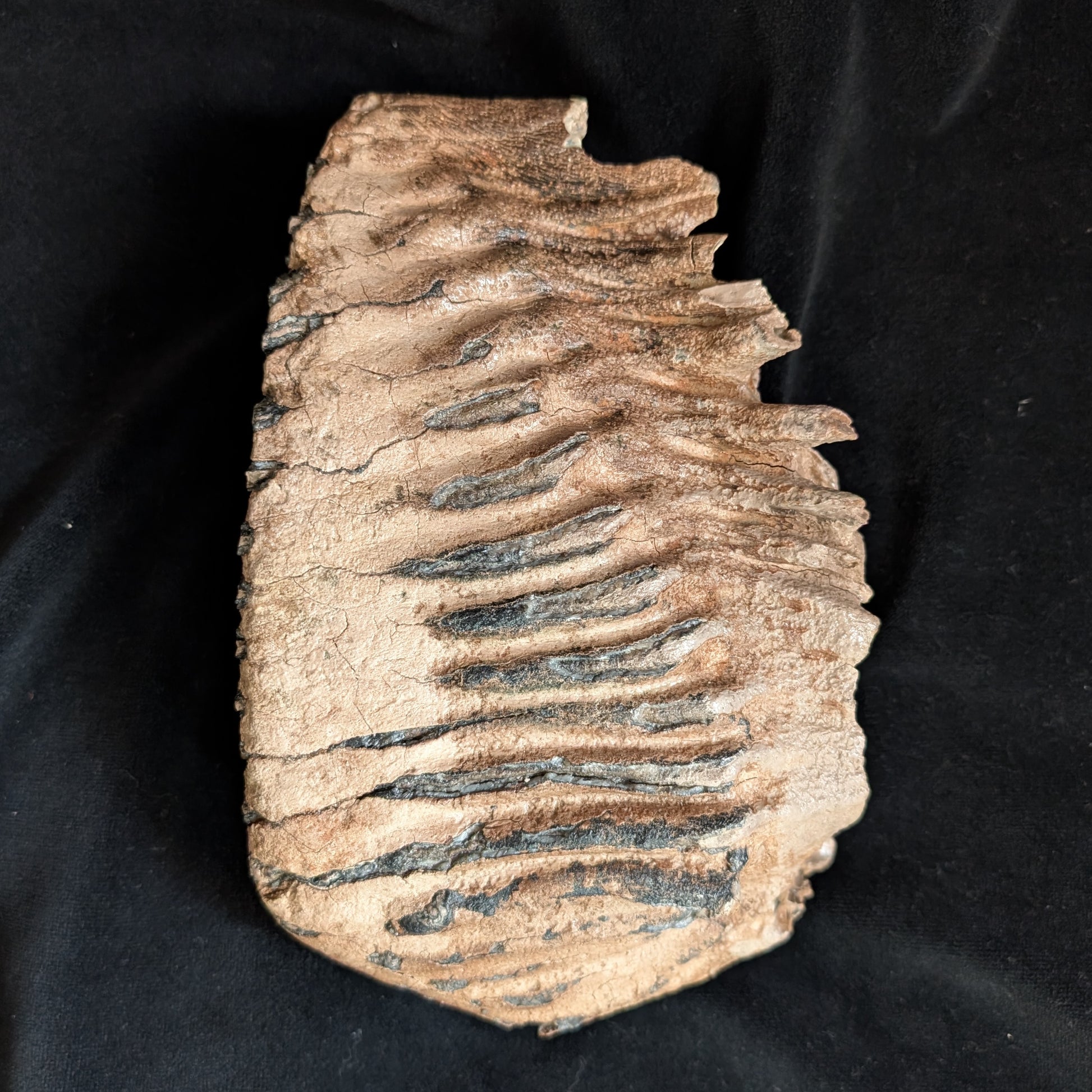 At the top of the molar is the darker chewing surface that would be used for grinding grass, and the roots of the tooth extend below.