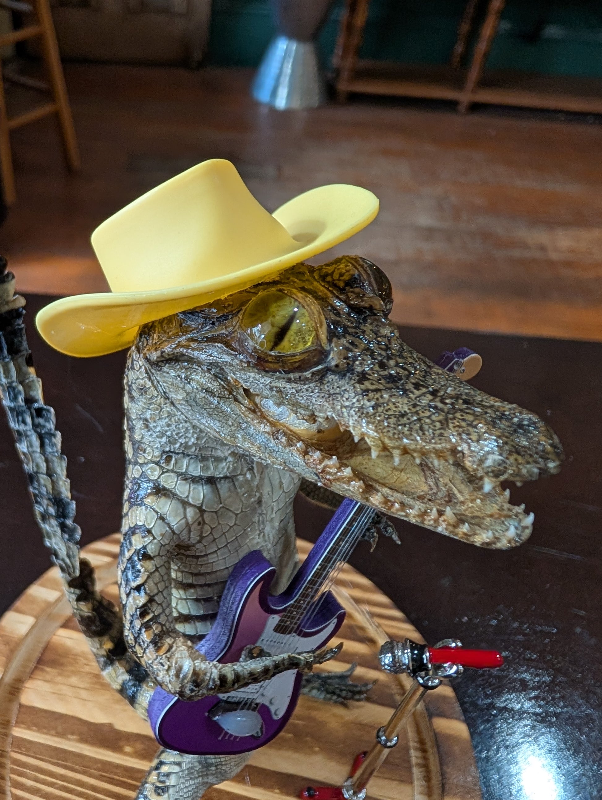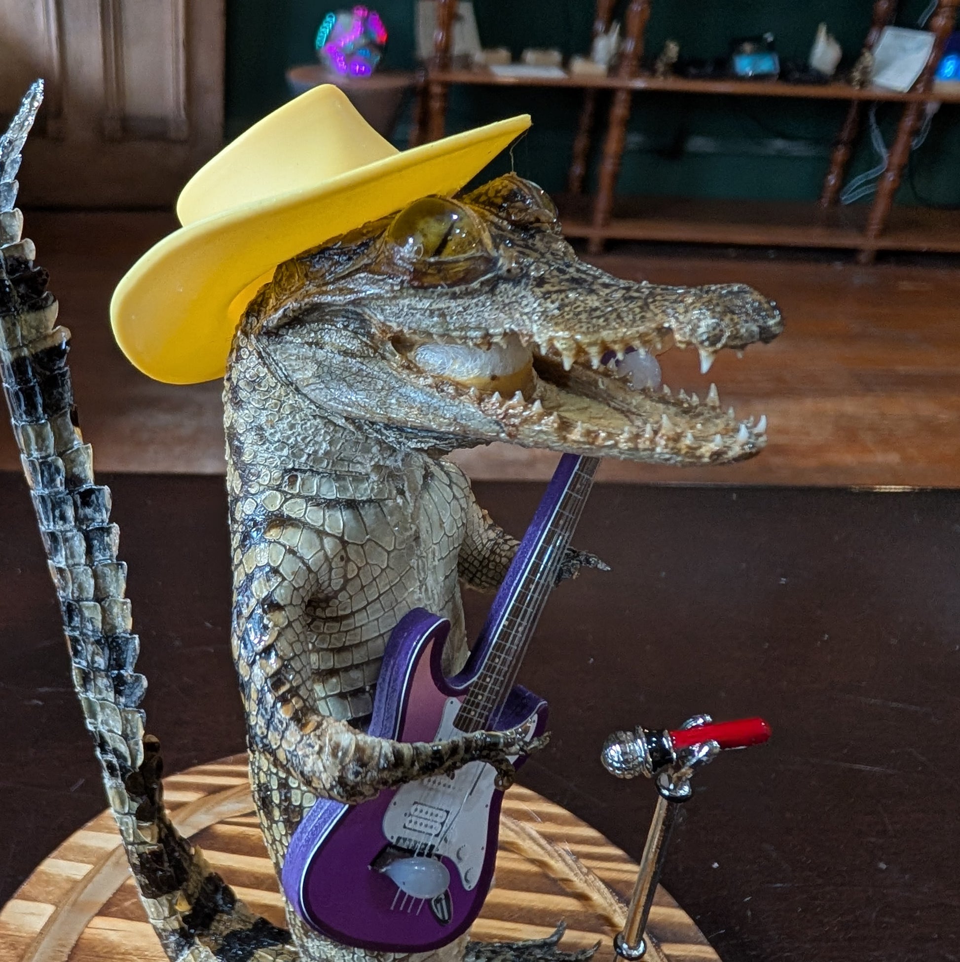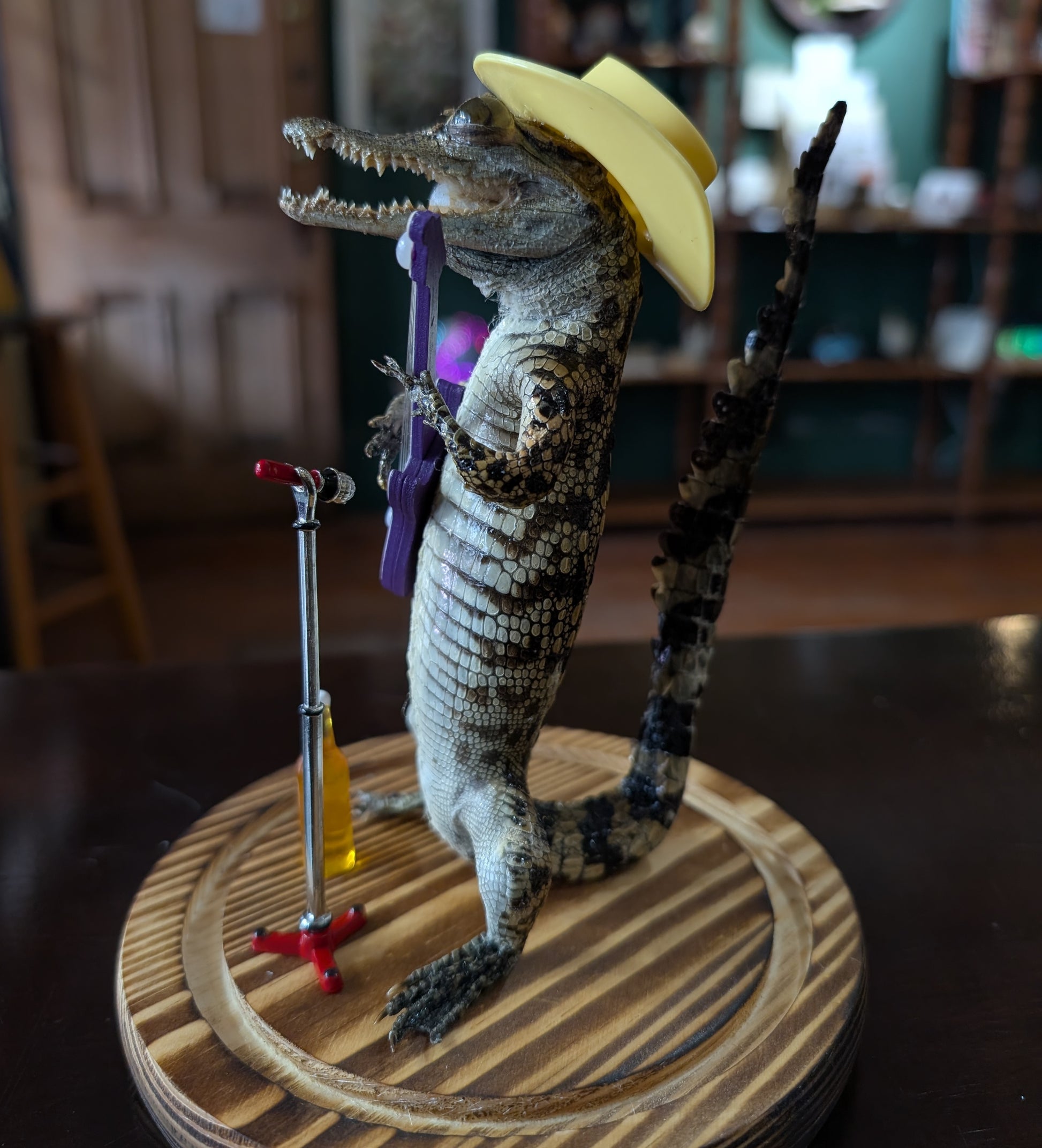 Add whimsy to your home with a real, taxidermied guitar-playing alligator! This little guy is approximately 6.5" tall and comes with a hat, a guitar, a microphone, and the teeniest bottle of Corona you'll ever see.