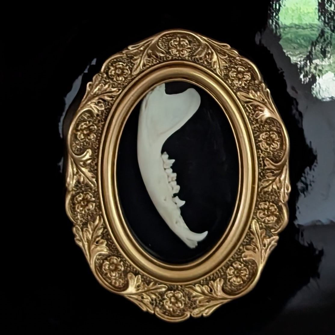 This vegan leather handbag features a real fox jaw built into the exterior! The handbag is hand-modified to incorporate a real deer jaw bone encased in a frame behind glass and sealed to allow for everyday wear. The handbag features a zipper closure, a zippered compartment, and an optional long carry strap.