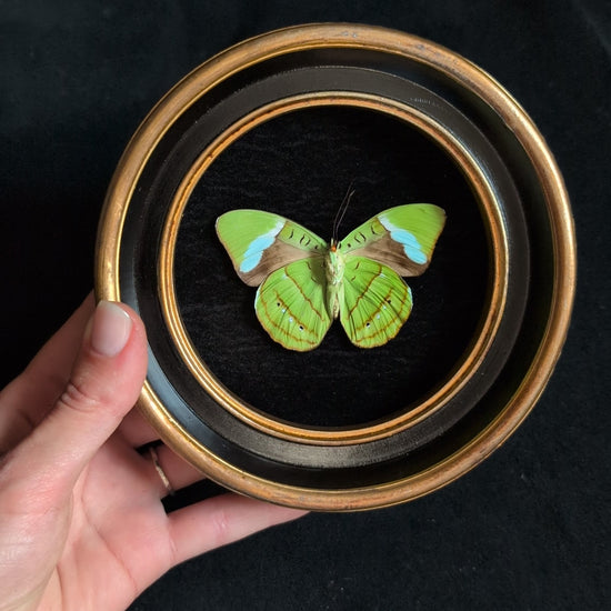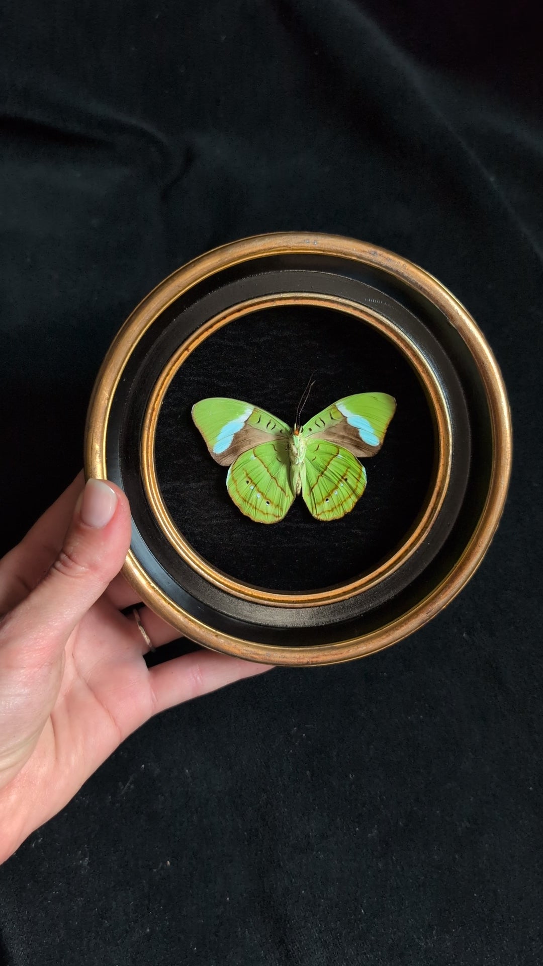 Real olivewing butterfly, set over a black velvet background in a vintage-style round frame. This butterfly's stunning shades of green are guaranteed to catch attention on any wall! Comes with a hook as well as an easel stand on the back of the frame.