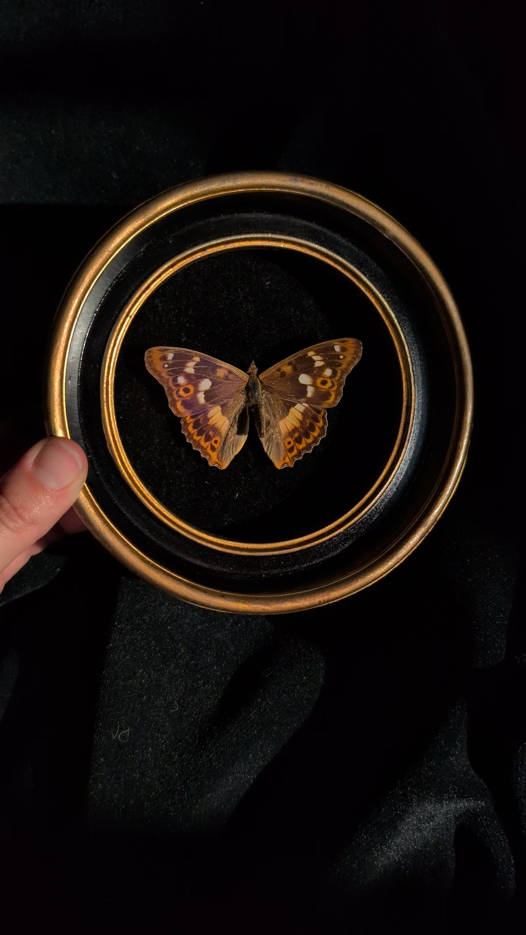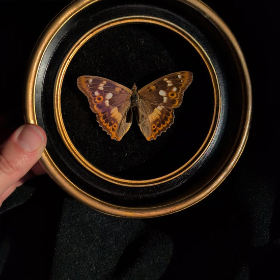 Real purple emperor butterfly, set over a black velvet background in a vintage-style round frame. This butterfly appears to be a golden-orange until light catches its wings - and then it flashes a gorgeous purple!