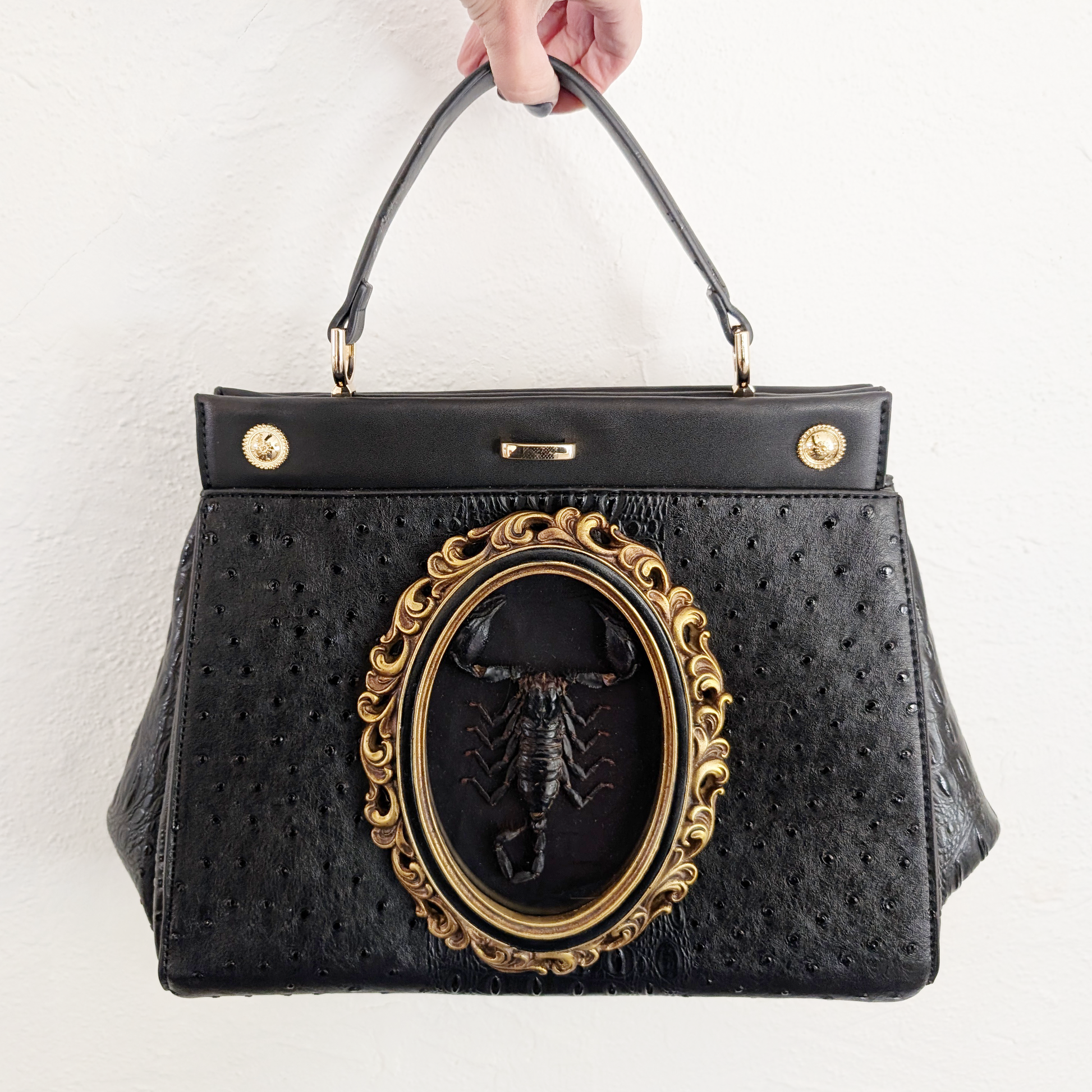 This vegan alligator leather handbag features a real scorpion built into the exterior! The handbag is hand-modified to incorporate a real scorpion encased in a frame behind glass, and sealed to allow for everyday wear. Magnetic closure and a full-length shoulder carry strap make it a practical accessory as well as a statement piece!