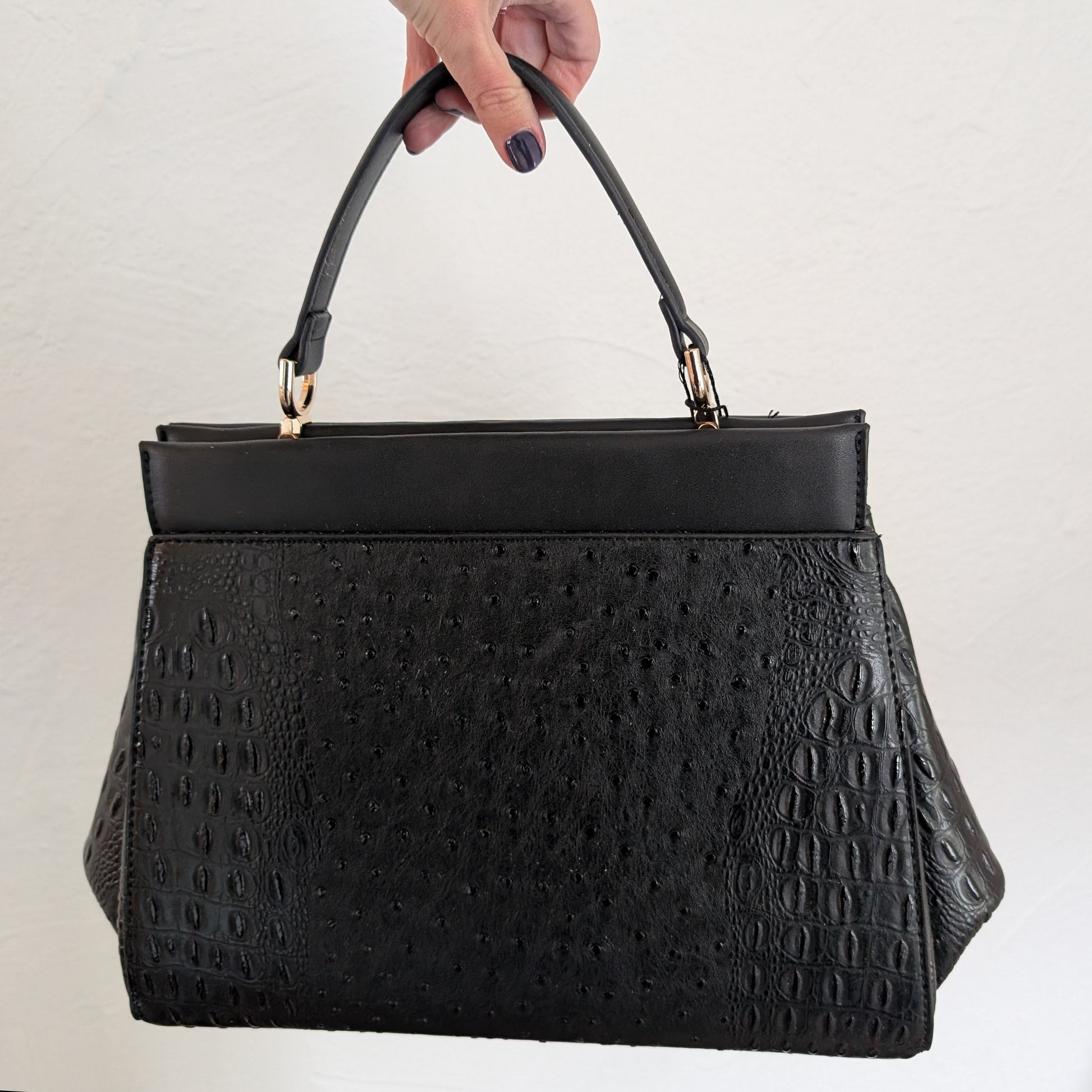 This vegan ostrich leather handbag features a real scorpion built into the exterior! The handbag is hand-modified to incorporate a real scorpion encased in a frame behind glass, and sealed to allow for everyday wear. Magnetic closure and a full-length shoulder carry strap make it a practical accessory as well as a statement piece!