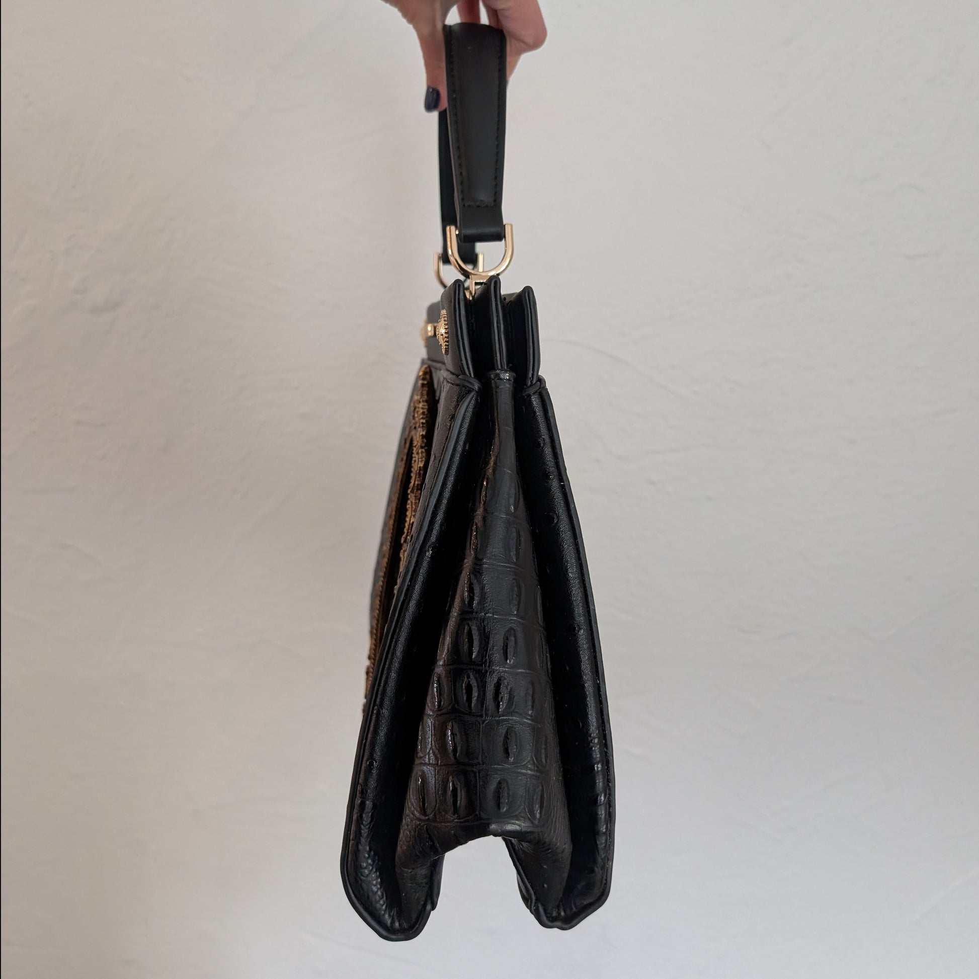 This vegan ostrich leather handbag features a real scorpion built into the exterior! The handbag is hand-modified to incorporate a real scorpion encased in a frame behind glass and sealed to allow for everyday wear. The handbag features magnetic closure and a shoulder strap.