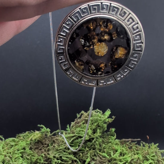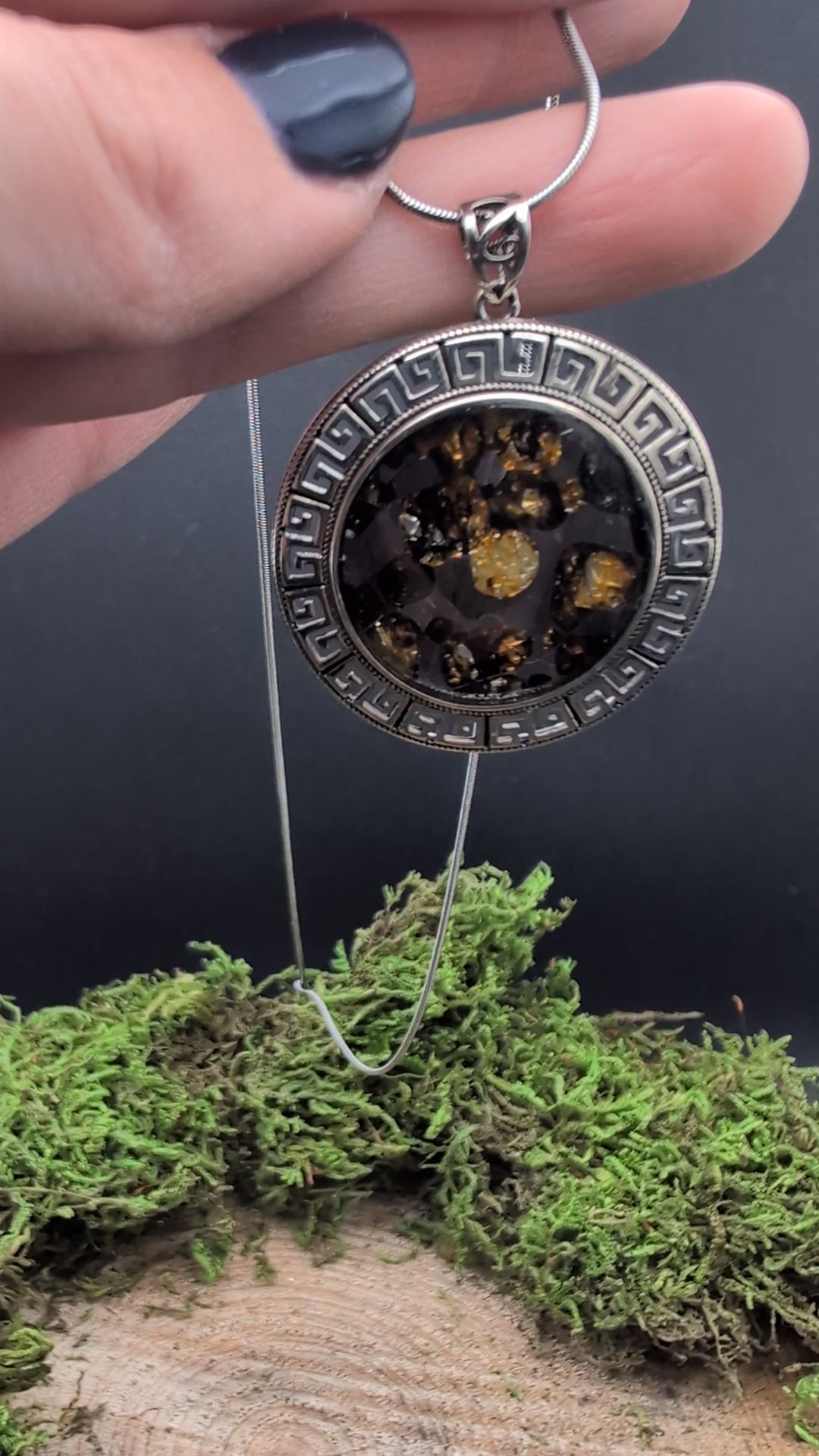 The meteorite in this pendant is covered with a protective layer of clear resin to protect the surface and ensure durability.
