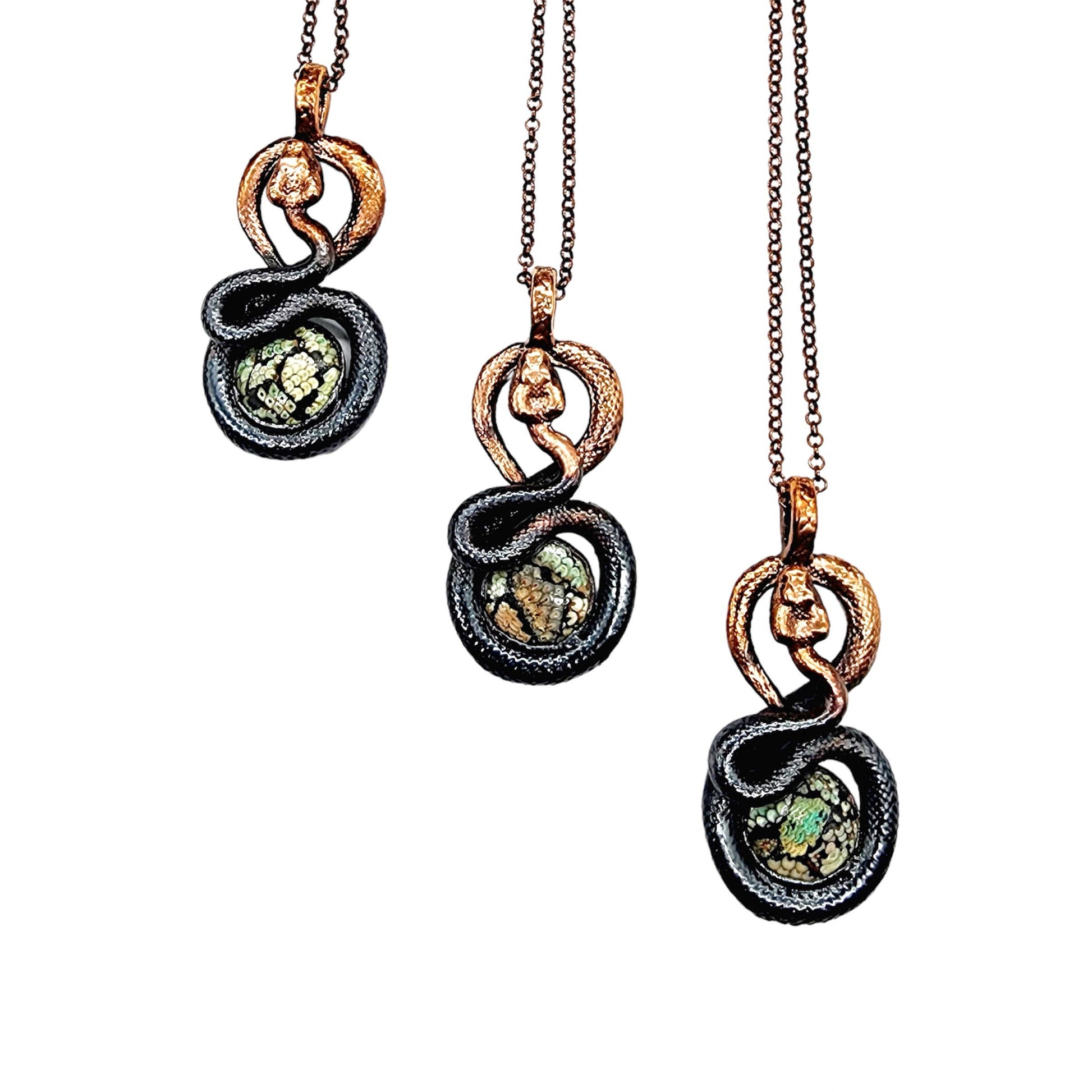 One copper Snakeskin Agate Serpent on a 24” copper chain. Snakeskin agate is found on Madura Island, Indonesia. Although it looks like snakeskin, it's actually a fossilized palate of ancient wrasse. Wrasse are a family of brightly colored marine fish.