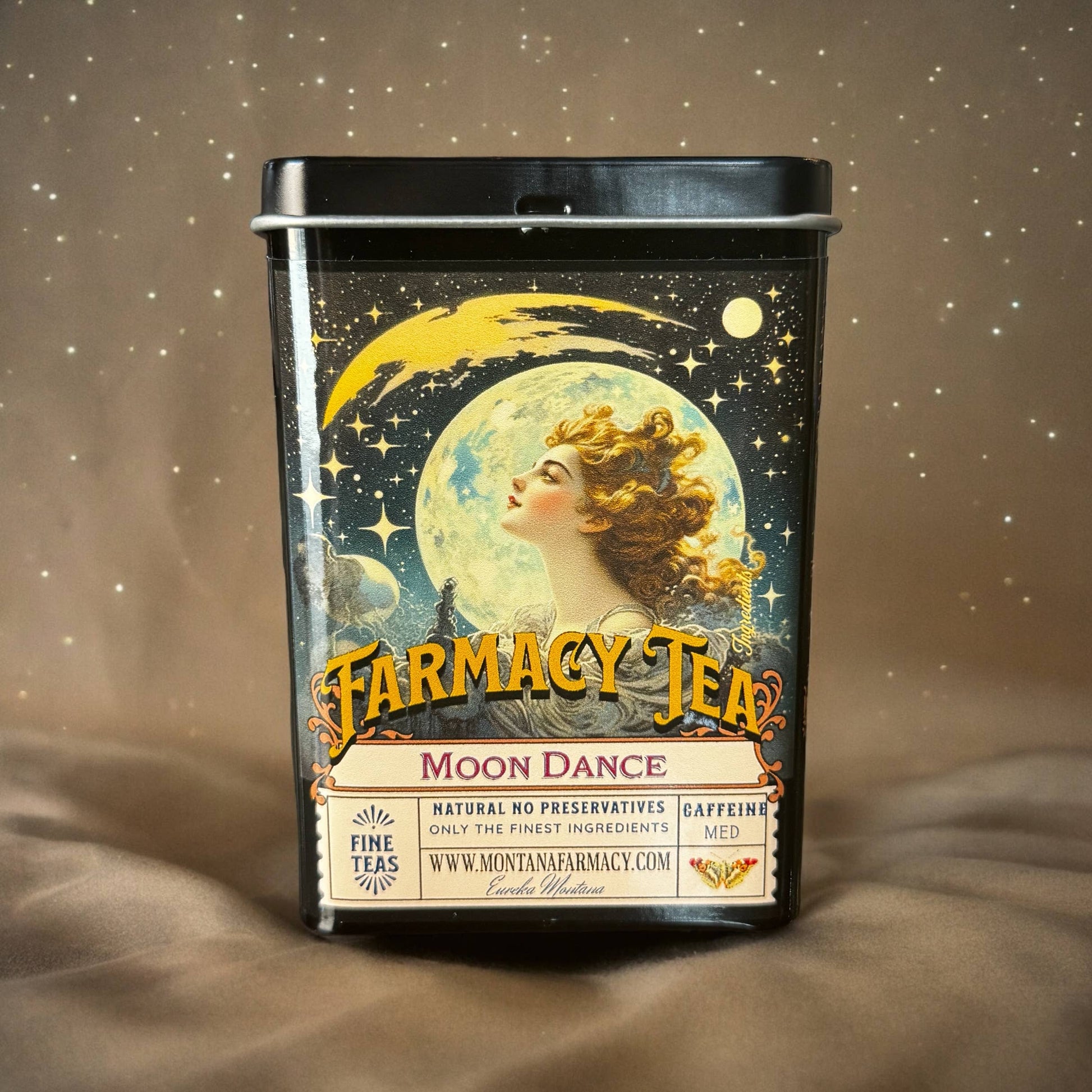 We are now offering select tea tins with tea bags for on the go tea time! This one has our lovely moondance Canadian ice wine Tea... great for on the go- Travel, camping, wedding gifts, gift baskets, Delish, invigorating full of flavor. Montana Farmacy Teas are highly sought after for flavor and design. Tea Tins are Palm/Travel size at: 2 3/8-- '' 7/8 '' 3 3/8 ''