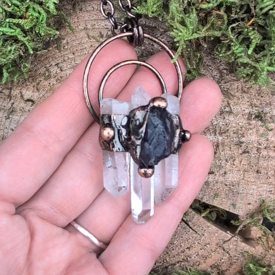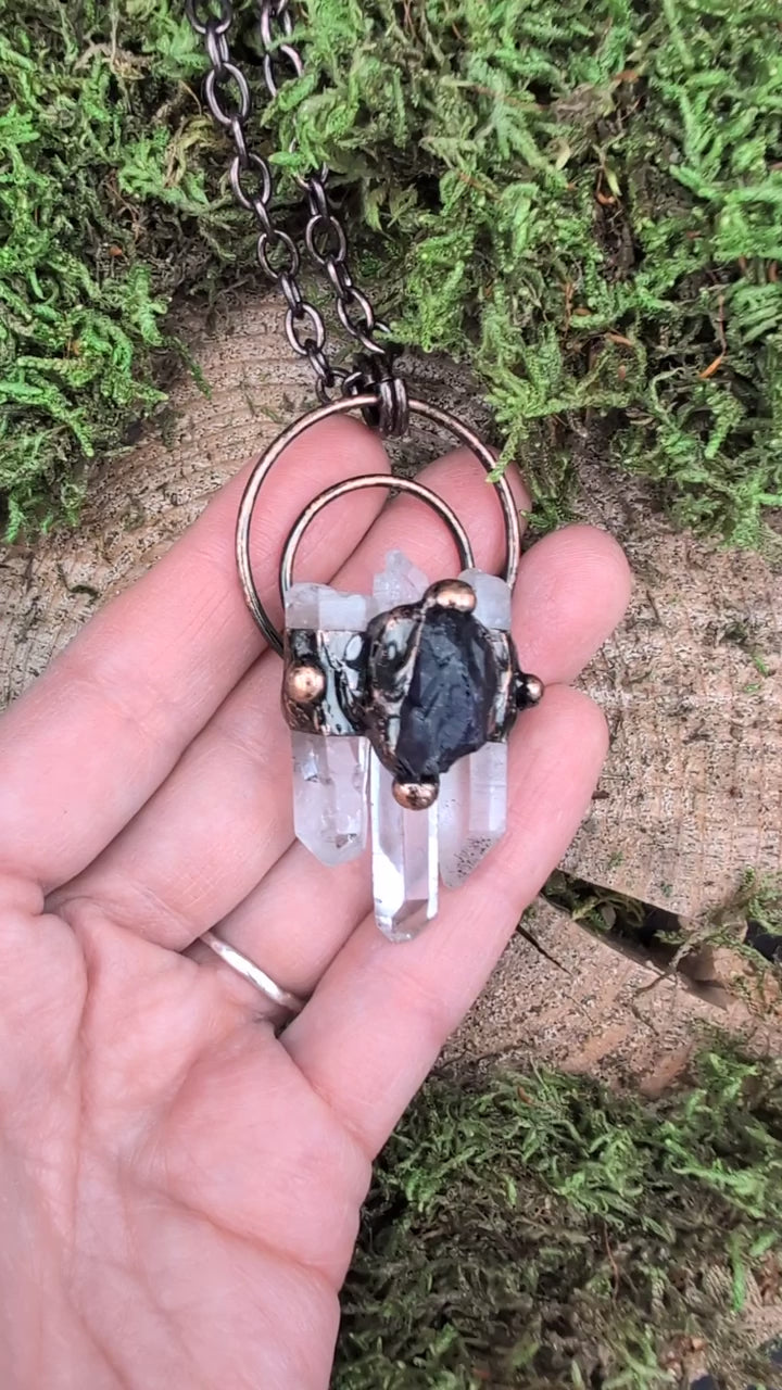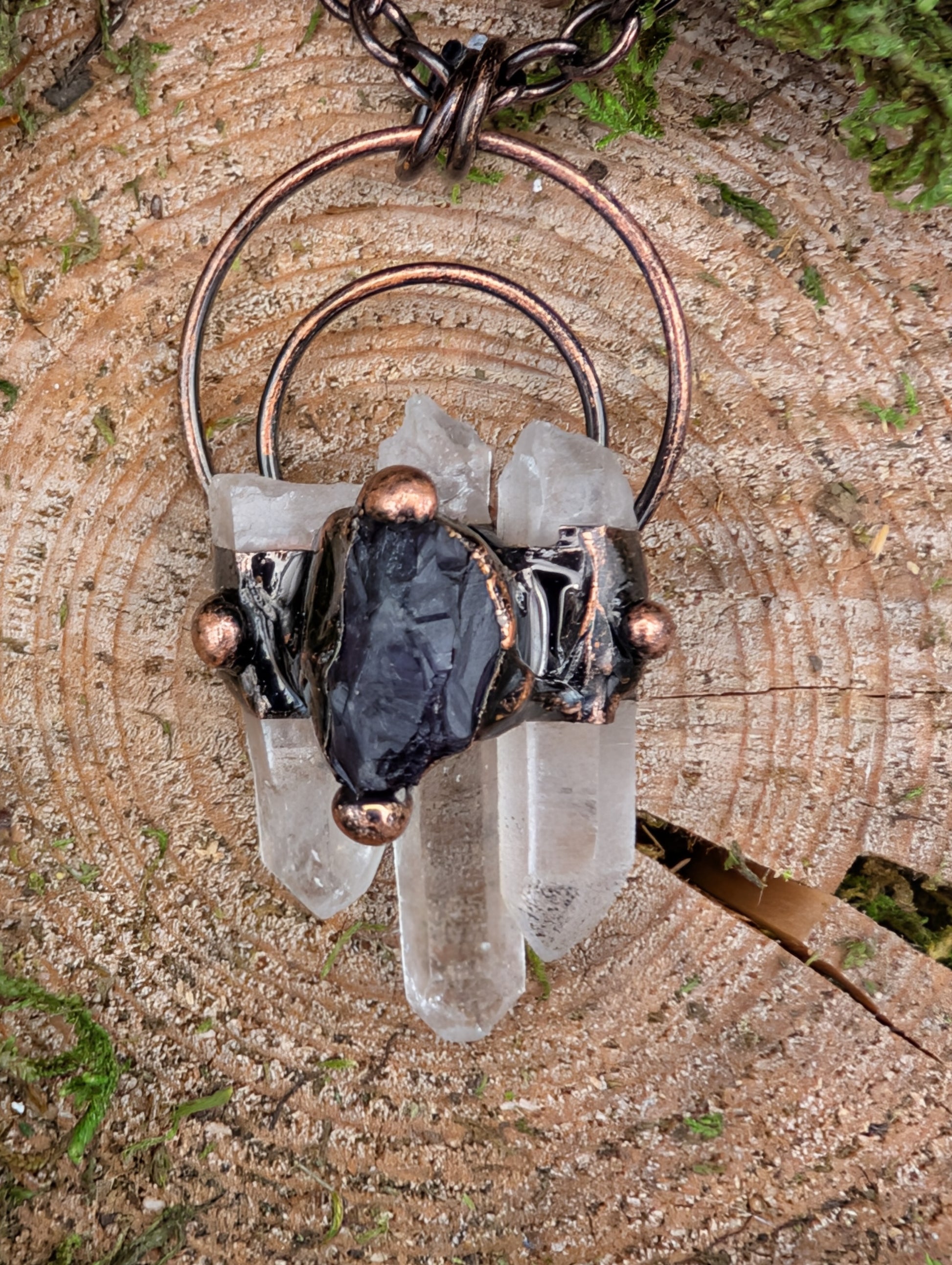 This pendant necklace features three clear quartz crystals and a rough amethyst in a copper setting.